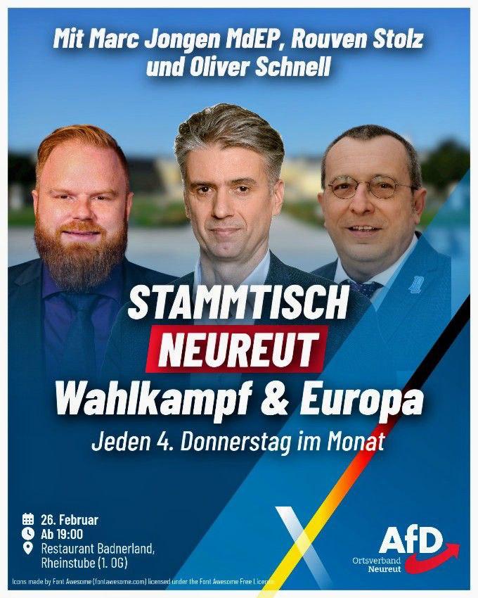 Am Donnerstag, den 26. Februar um 19:00 Uhr laden wir herzlich zum nächsten AfD-Stammtisch in Neureut ein.