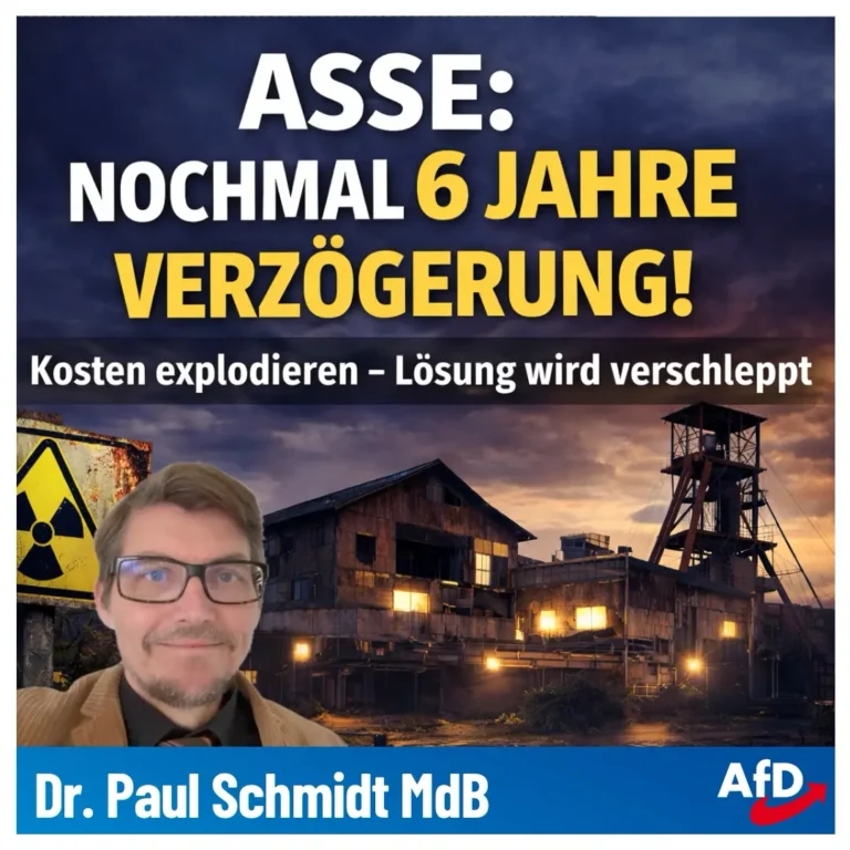Die Rückholung der radioaktiven Abfälle aus dem früheren Salzbergwerk Asse kann nicht wie geplant ab 2033 erfolgen, teilte die Bundesgesellschaft für Endlagerung (BGE) in einer Pressemeldung vom 14. April 2026 mit. Dazu erklärt der Sprecher der Arbeitsgemeinschaft Kernkraft der AfD-Bundestagfraktion Dr. Paul Schmidt: