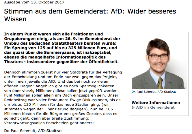 In einem Punkt waren sich alle Fraktionen und Gruppierungen einig, als am 26.9. im Gemeinderat der Umbau des Badischen Staatstheaters beraten wurde: Ein Sprung von 125 auf bis zu 325 Mio. Euro, und das quasi über die Sommerpause, ist inakzeptabel, ebenso die mangelhafte Informationspolitik des Theaters – insbesondere gegenüber der Öffentlichkeit. Dennoch stimmten zuerst nur […]