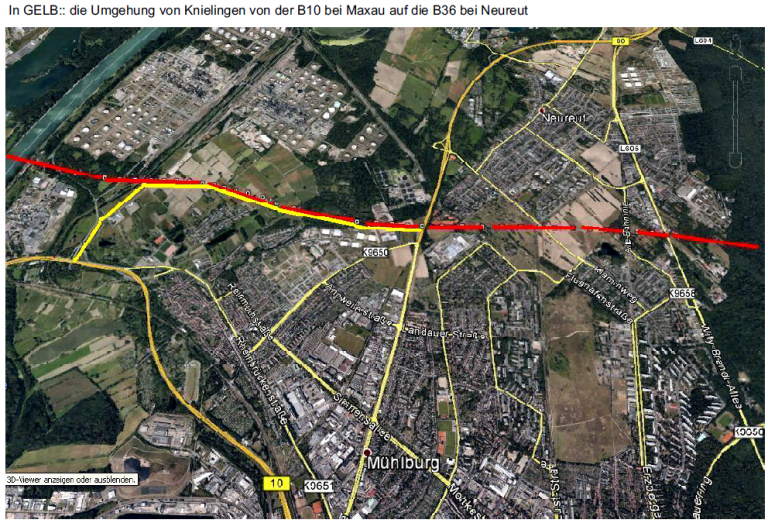 Das bereits Anfang 2014 vorgestellte Konzept der AfD Karlsruhe-Stadt sieht vor, den sog. Pförtner, d.h. die Verengung der Fahrbahn von drei auf zwei Fahrspuren, von seiner bisherigen Position – einige hundert Meter hinter der Brücke auf der badischen Seite – hinter das Ölkreuz zu verlegen. Die dritte Fahrspur wird dann am Ölkreuz ausgeleitet und über eine auf der frei gehaltenen Nord-Tangenten-Trasse zu bauende Straße bis zur B36 im Norden von Knielingen geführt. So werden nicht nur die Staus auf der Brücke vermieden, auch Südtangente, Honsell-Knoten und Neureuter Straße erfahren endlich die dringend nötige Entlastung – in beiden Richtungen und ohne den Bau einer weiteren Rheinbrücke!